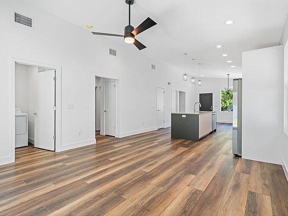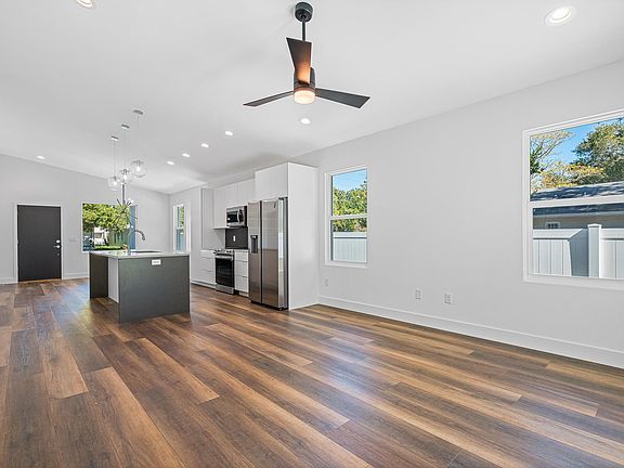 Sleek and Contemporary 3-Bedroom Home! This stunning 3-bedroom, 2-bath, 2-car garage home showcases modern design and thoughtful craftsmanship throughout. Vaulted ceilings create an airy and open feel, perfectly complementing the luxury vinyl plank flooring, custom cabinetry, and quartz countertops in both the kitchen and baths. The chef-inspired kitchen features stainless steel appliances, abundant storage, and elegant finishes. The open floor plan is light and bright, enhanced by impact-rated windows and modern lighting that bring a sense of sophistication to every space. From the family room, impact sliding glass doors open to a covered lanai and fenced backyard ideal for outdoor relaxation or entertaining. The rear-entry 2-car garage provides convenient access through the laundry room, complete with a washer and dryer. The spacious primary suite includes a walk-in closet and a beautifully appointed bath with a walk-in shower. Bedrooms 2 and 3 feature double-door walk-in closets and share a full hall bath with a tub/shower combination. Located in a prime area with easy access to Gulfport, downtown St. Petersburg, shopping, dining, entertainment, and beaches, this home perfectly blends modern living with coastal convenience.