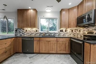 This spacious 2000 sq ft home , sits on a stunning, private half acre in Bloomfield hills. This 3 bedroom, 2.5 bath home sleeps 6 and is equipped with a full work station. The luxurious master suite features a king sized bed and in suite full bath. Each of the 2 additional bedrooms have queen beds. The home has 2 living spaces: both a family room AND a den, each equipped with 2 MEGA 75" flat screen TVs (including subscriptions to Youtube TV, Disney+, HBO Max, Netflix and Amazon Prime). The den is set up with a complete work station including a corner desk which has both seated and standing positions. The kitchen is equipped with brand new GE appliances throughout. Tenant responsible for Gas, Electric and Cable