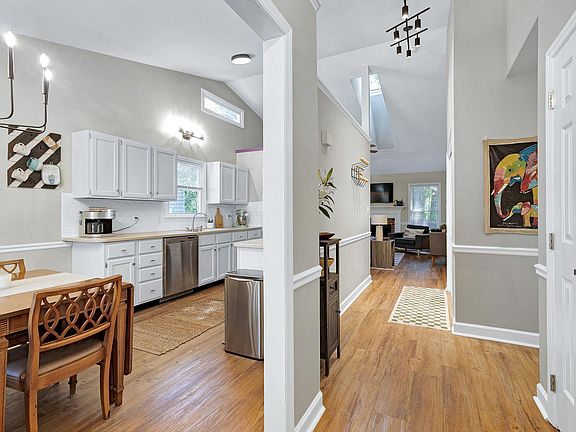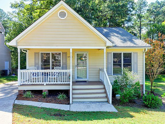 Cozy ranch home with a welcoming front porch in convenient North Raleigh location. The floor plan makes entertaining easy and relaxing a breeze. Beautiful hardwood style floors throughout the home. Oversized light-filled family room with vaulted ceiling, skylights & gas log fireplace. Sunny, eat-in kitchen has high vaulted ceilings, stainless steel appliances, tons of beautiful white cabinets and solid surface countertops. Unwind in the large Primary suite off the back of the home with walk-in closet. The two additional spacious bedrooms and a full bath leave you with plenty of space. HVAC 2018. Expansive deck overlooks fantastic fenced-in backyard with wooded views. Enjoy close proximity to community amenities including pool, tennis court and playground.