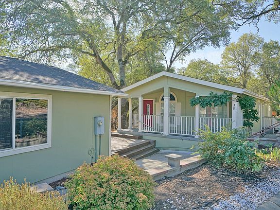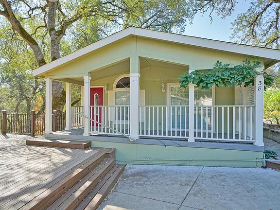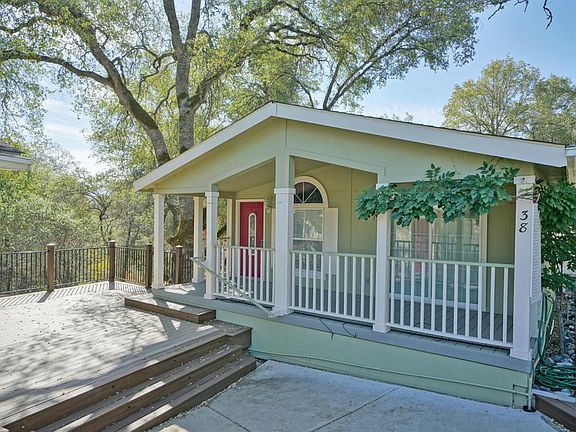 Well maintained home with curb appeal, local views and a detached 2-car garage! Relax & enjoy the view from the lovely covered front porch or the composite deck that overlooks open space on one side of the home. Features include 2 bedrooms, 2 full baths, vaulted ceilings, open bright kitchen & living area, cozy pellet stove, & spacious indoor laundry room. Refrigerator, washer & dryer included. Don't miss your chance to own this wonderful home in a premier senior park!