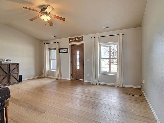 Nestled in the serene countryside of Cheney, KS, just minutes from Lake Afton with quick and convenient access to Wichita, this spacious 4-bedroom, 2-bathroom home offers the perfect blend of privacy, comfort, and functionality. Situated on 5.65 picturesque acres, this property features a beautifully landscaped front yard with open space for pasture, gardening, entertaining, while the back half is a wooded retreat, ideal for nature lovers. Built with insulated concrete form (ICF) construction, this 2,389 sq. ft. home is designed for energy efficiency and durability. Inside, you'll find a split-bedroom floor plan with an inviting atmosphere, enhanced with updated engineered hardwood flooring, large windows showcasing scenic views, and a cozy wood stove in the family room. The spacious kitchen offers the perfect space for cooking and entertaining, featuring quartz countertops, abundant cabinetry, and two pantries. The master suite offers a true retreat, complete with a walk-in closet, a spa-like ensuite with a jacuzzi tub, and a tiled shower. Enjoy the outdoors year-round with a screened-in porch, perfect for morning coffee or evening gatherings. The property also boasts a temperature-controlled oversized 2-car detached garage; perfect for that hobbyist and a spacious and versatile pole barn offering plenty of room for extra tools. Whether you are entertaining or need a great space for the kids to play, the property also includes a volleyball net, an expansive playground, and a dog run/chicken coop for the fur kids! Additional highlights include a reinforced concrete storm room, offering unmatched safety and peace of mind during Kansas storms, and a spacious, separate laundry room designed for convenience and organization. Recent 2022 updates include a brand-new roof, fresh interior paint, and stylish engineered hardwood flooring, enhancing both the home's durability and aesthetic appeal. Located less than a mile off black top this secluded yet accessible property is a rare find—schedule your private showing today and experience the tranquility of rural living!