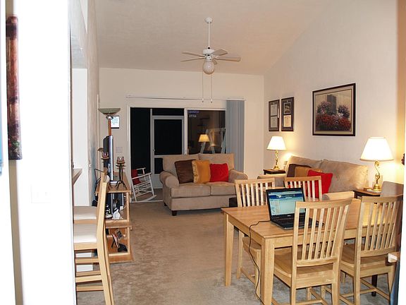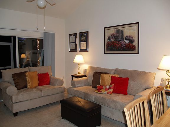 Come home to peace and quiet among mature live oak trees with Spanish moss that sways in the wind. Desirable 1 bedroom/1 bath with attached 1 car garage. 790 square feet of living space. Additional space in the attached garage and front and rear porches. org/floorplans.shtml Wall-to-wall beige carpet in living, dining, and bedroom. Beautiful warm, sand colored 12 inch ceramic tile in entrance way, kitchen, bath, and laundry rooms High vaulted ceilings in living room, dining, and kitchen. Open concept living and dining room. Living room with large ceiling fan with elegant bell-shaped light, beautiful sliding glass door. Dining area with large window. Private covered, and screened-in rear patio, with its own ceiling fan and light, this is off the living room. Screen door off of the patio opens to a magnolia tree and shrubbery behind the unit, faces east. Spacious kitchen with refrigerator, self-cleaning oven, microwave, dishwasher, shelved pantry, sink with garbage disposal and large goose-neck faucet. Ample space for above cabinet decorations to give the kitchen your personal touch. Breakfast bar area sized for seating for two. Bedroom with large window and lighted ceiling fan, generous walk-in closet with built-in shelving. Bathroom with full size tub, long counter space with ample cabinet storage under the counter top, counter length wall mirror, and mirrored medicine cabinet. Pocket door in hallway between the bathroom and bedroom makes for a private ensuite if desired. Laundry room with ample storage shelves, comes equipped with full size washer and dryer. located off the kitchen. Attached one car garage, with a door that enters into the laundry room. Covered front porch perfect for potted plants. Central air conditioning. Smoke free unit. The Gables Complex Amenities Gated community Resort style swimming pool and hot tub. Cardio and weight training fitness center with sauna room (Available 24 hours). Clubhouse with billiard table, perfect for entertaining. Lighted tennis and basketball courts. Free car wash area. Privately owned. Convenient location. Next door to Celebration Pointe. Close to I-75 and Butler Plaza Sopping. Less than 3 miles to UF and Shands. On RTS bus route. One year lease.