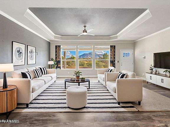 Nestled at the tranquil end of the road, this inviting home sits on two beautifully landscaped acres and offers a harmonious blend of comfort and style with an OWNED solar system. Step inside todiscover large, sun-filled rooms adorned with modern colors, and a striking cove ceiling in the living room that adds a touch of elegance. The thoughtful layout includes ahidden pantry for extra convenience and storage. Outside, enjoy stunning views and the peace of mind provided by sturdy rail pipe perimeter fencing. A roomy two-car carport shelters your vehicles, while the expansive driveway ensures ample parking for residents and guests alike. This property is perfect for those seeking spacious living, modern touches, and a serene environment to call home.