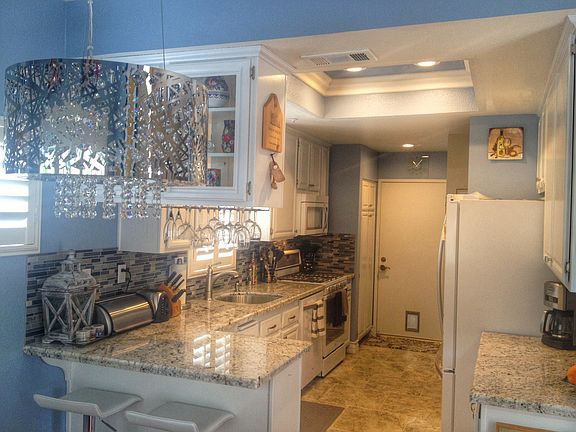- Custom Townhouse in the highly desirable Pelican Pointe Villas, 4700 Warner Ave. - Only 17 units which are 90% owner occupied. Neighborhood feel throughout. - Fabulous location near Huntington Harbor, inside complex location away from street. - Walking distance to restaurants and stores on Warner or in the Huntington Harbour Center. - One mile to the beach and a short walk to the Bolsa Chica Wetlands nature trail. This unit features:- Total of 1,372 square feet, plus patio and garage.- Two upstairs master bedrooms each with en-suite bathrooms, cathedral ceilings with modern, remote controlled ceiling fans. Large lighted closets. - Central air and gas heating. Gas burning fireplace. Fire sprinklers.- New (2014) dual pane windows, with custom shutters. - Kitchen features new custom granite counter tops, new (2013) appliances Whirlpool Ice White with stainless trim (gas cooking), crown molding, new recessed LED lighting. - Completely remodeled downstairs guest bathroom. - Hardwood and custom tile floors throughout. - New, top of the line (2014) Whirlpool Duet front-loading washer and steam dryer, on stands. - Desirable inside end unit with only one common wall and parking area. - Two car attached garage with lots of storage shelves. - Custom track lighting in living room. - Patio with custom bamboo fencing. - Common area with summer time heated pool and year around heated spa.- Small pet ok with deposit. Non smokers only.- Previously owner occupied.