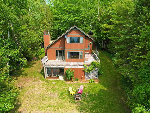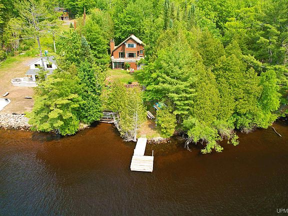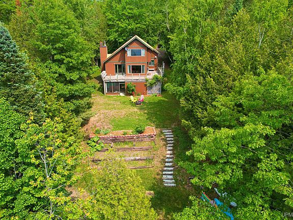 Lake living at its best! This beautiful custom-built home sits on 52 feet of prime Portage Lake frontage, with west-facing views to enjoy stunning sunsets year-round. A phenomenal launching point for all your boating or fishing adventures, and just 7 miles from Houghton. The very deep lot features a perfect sandy bottom swimming cove, terraced gardens, and plenty of shade trees. The home’s main level has an airy, open floor plan, with tongue and groove lofted ceiling and accent wall. Wrap around decks are accessible from French double doors off the dining area. The kitchen has a smartly designed island with breakfast bar, all inlayed with a vintage map of the Keweenaw Peninsula! A wood burning fireplace makes for cozy fall and winter nights, and a very unique ‘crows nest’ office overlooks the living room. Large master bedroom with walk in closet enjoys massive picture windows overlooking the lake. Two full baths, including a large clawfoot tub just off the master. A semi-finished, walk out basement has the potential for additional bedrooms or living space. There is plenty of storage in an additional A-frame outbuilding behind the main home. Road level two car garage has a full walk out basement, perfect for a workshop. A 25-foot removable dock and shore station are included. Recent updates: New well and septic in 2020, new main floor laundry, professionally painted exterior in 2022, professionally epoxied garage floor in 2022, new high efficiency furnace. Available for immediate occupancy. Taxes may change upon sale. Sellers request that offers expire no earlier than June 28, 2023 with a minimum response time of 72 hours.