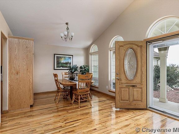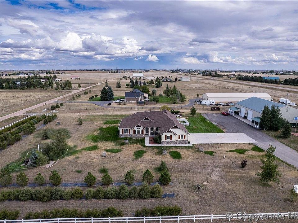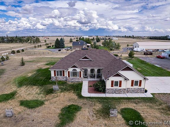 This custom built home with 6204 square feet and a 60X80 shop is the best value you will find in Cheyenne, WY! Beautiful finishes include hardwood floors throughout, granite countertops, custom tile and stone work. The 36 x 16 living room with a vaulted ceiling and gas fireplace will be the focal point of the home. The owners suite has 2 walk-in closets, a spa-like bathroom, walks out to the patio and has room for a sitting area. 2 additional bedrooms on the main floor with a jack & jill bathroom. Options are endless with the 24X31 great room, would make a perfect game room or mother in law suite. Finished basement with a beautiful custom bar, family room, craft room and 2 more bedrooms. The 3 acre property has no covenants and is lined with mature trees, a private patio and fire pit area. The shop has everything a mechanic, business owner or toy collector could dream of to include overhead loft storage, 5 garage doors, a dry bar and an apartment with a 3/4 bathroom. One of a kind property conveniently located minutes from town and ready for its new owners.