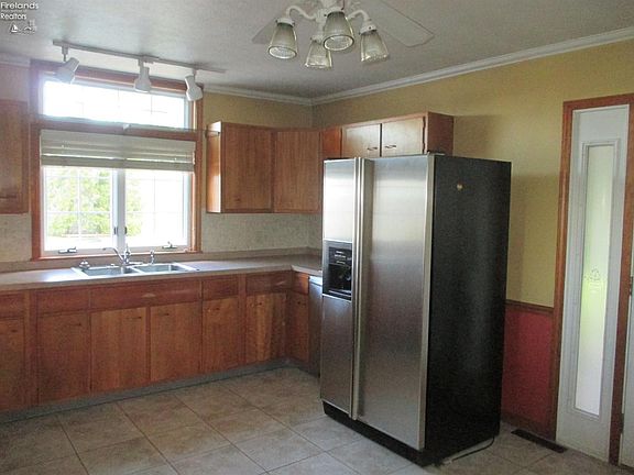 The whole package! Homey and cozy 1 1/2 story, 3 BR on over an acre in Polar Bear Country! Ready to move in. Refinished wood floors, new carpet up, wood burning fireplace, super large eat-in kitchen with appliances. Washer and dryer stay too. Oversized 2 1/2 attached car garage plus 26 x 40 barn plus 16 x 30 workshop. Private back yard with paver patio. 200 amp electric in house, 100 amp in workshop. Public water plus well for irrigation. Enclosed porch. Central air conditioning. Invisible fence. One year warranty for buyer. Sandusky address, Margaretta schools.