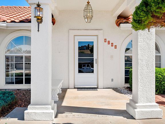 This single-level California Spanish-style ranch sits on an elevated lot, ideal for comfort and privacy. It features a 3-car garage, a classic tiled roof, arched windows, and a landscaped courtyard with a tiered fountain and covered porch. Tall ceilings and large windows fill the home with natural light. The inviting living room, with a stone fireplace, has a slate and vinyl flooring mix. The chef's kitchen offers expansive countertops, a tile backsplash, and ample cabinetry, with a view of the serene Arizona room for year-round enjoyment. This home includes three spacious bedrooms, two full bathrooms, and a versatile den: a large laundry area, extra storage, and a low-maintenance private backyard.