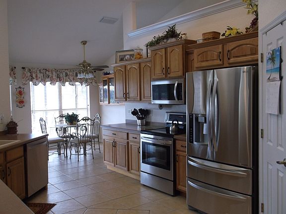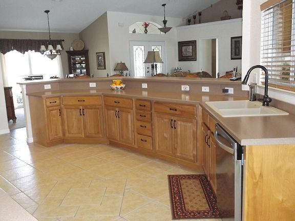 Beautiful pool home located on # 3 hole of the Deer Run Golf Course. The kitchen features solid wood cabinets with pull out drawers at the bottom, stainless steel appliances, a walk in pantry, and a pass through to the lanai bar. The living room has 12 feet of sliding glass pocket doors that lead out to the pool. The 14 x 28 pool has solar heat and a fountain. The lanai has a bathroom so you don't have to track through the house with wet feet. The 18 x 13 master bedroom has a tray ceiling and has sliding glass doors leading out to the lanai. The home has sky lights making it bright and cheery. The over sized garage has a separate golf cart door. The garage also has a skeeter beater. Lots of nice features in this well maintained home.