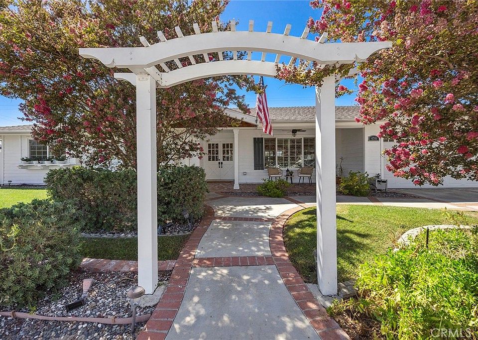 What an opportunity! Located in the center of the city, with the new library just across the street and the new town center a block away, you are in the sweet spot of Yorba Linda. With great curb appeal and single level living this is a home of your dreams. Step inside and you are standing on beautiful Maple wood floors that are throughout. Spacious living room that is open to the kitchen as is the family room with a fireplace, is all set for a gathering of friends and family. French doors take you to the backyard. The kitchen has granite counters and a large island for bar seating, the cabinets are white adding a nice contrast. With a built-in refrigerator, Dacor stove and microwave, a wine cooler, dishwasher, and a water spicket above the stove to fill that big pot you can plan that party and have all the space and appliances you need. Step down the hall and on the right side is the guest bath and then the laundry room. On the left side are two big bedrooms both facing the front of the property. At the end of the hall, you will find a remodeled bath with quartz counter and sink and a shower that is beautiful. Finally, the primary bedroom with lots of closet space and a Dutch door to the backyard and a space under its own roof, ideal to exit to the spa for a relaxing evening. The remodeled master bath could not be designed any better with a soaking tub and a separate large shower with the rain shower head as well the a normal shower head. Dual sinks and a private toilet room complete the inside of this lovely home. Back outside is a space designed for seating out of the weather, whether sun or rain, a covered patio for seating for a BBQ with others using the BBQ that is set in the outdoor island. There is artificial grass and a raised brick portion of the patio for lounging. The inground spa sits in the middle of the backyard. This great pocket of homes shares a large community pool area that includes ping pong tables and a shuffleboard and a BBQ. Come and take a look at you won’t be disappointed!