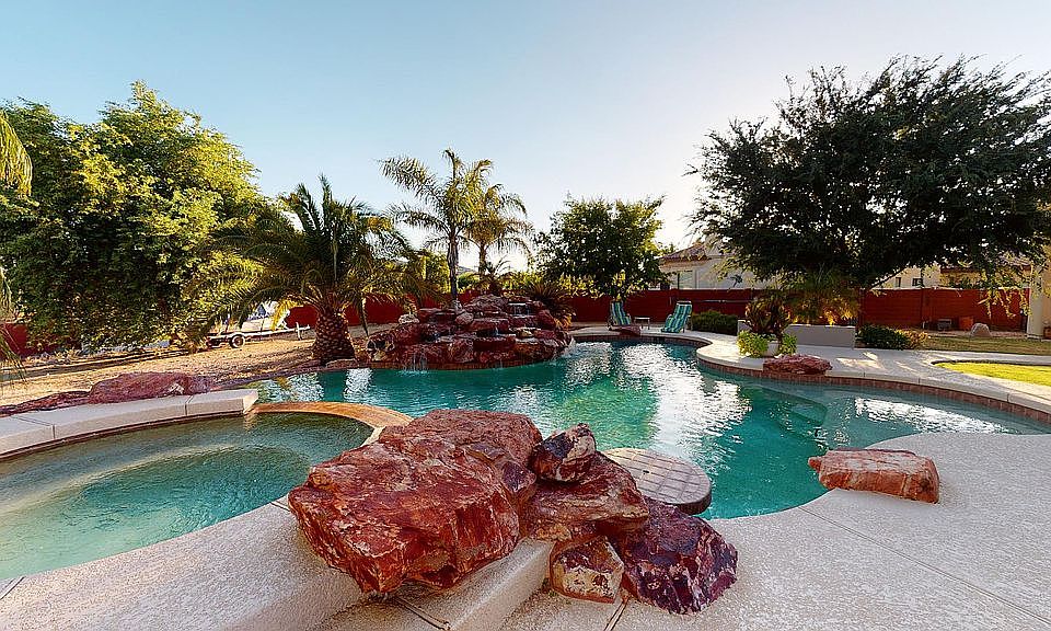 Lighted waterfalls grace the front & back yards of this magnificent custom home. This 3676 sf home sits high on a corner, 1+ acre lot in the highly sought after Saddleback Meadow subdivision. No HOA. North/South exposure. View from back yard is mountains, beautiful sunsets, six-flags water park closeby and driving range at 500 golf club. Mature landscaping, surrounded by pineapple palms for resort-style living . Pebbletec, negative-edge pool with diving rock. Surrounded by $1 mil+ homes. 15' ceilings in entry way, 12' rest of house. Coffered ceilings in master. Wolf double ovens. Subzero fridge. RV gate and room to park in side & backyard. Workbench & cabinets in garage. Winding paver driveway. Open concept living area great for entertaining All utilities (water, electricity, sewer, and gas) paid by tenant. Swimming pool maintained by tenant.