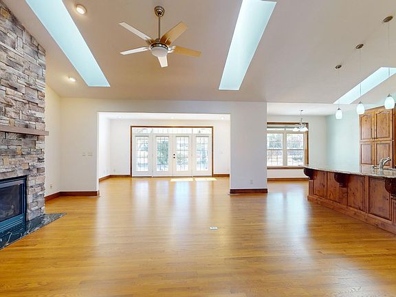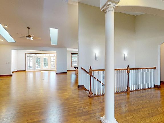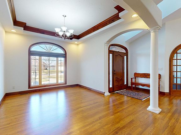 Featuring several recent major updates, this custom crafted home in Chestnut Grove Subdivision sits on an oversize lot that backs to a multi-subdivision walking & biking trail. The front entry leads into an open concept living room, dining room & kitchen layout under soaring cathedral ceilings with more than a thousand square feet of freshly refinished custom oak floors. Other highlights include abundant natural light from the skylights and oversized windows throughout. The current owners updated the fireplace with a floor-to-ceiling stone surround that is now the centerpiece of the great room. A flexible second living space features windows on three sides and a wall of glass that opens to the massive covered back patio. The gourmet kitchen features plentiful custom cabinetry, tile backsplash, a massive island overlooking the Great Room, and a full complement of upscale stainless steel appliances. A stunning set of arched French doors lead to a study that shares a Jack & Jill full bath with the front bedroom. That bedroom boasts a large walk-in closet and an oversize window with a window seat with integrated storage along with open shelves flanking each side of the window. The luxurious primary bedroom suite features a recently replaced oversize Andersen sliding glass door that creates a wall of glass overlooking the back patio and the backyard. The current owners did a complete reimagining of the en suite bath, which features an indulgent custom glass shower with multiple shower heads, including an overhead rainshower. The two vanity areas are separated by huge full-length linen storage cabinets. The bath also features heated tile floors. The walk-in closet features solid built-in organizers on three sides. The open stairs descend into nearly a thousand square feet of open living and entertaining space, featuring two oversize windows with terraced stone block wells for drastically increased natural light. There is also an elaborate hand-crafted bar and kitchenette area. A dedicated theater room includes soft sconce lighting, two tiers for stadium seating arrangements, and built-in speaker wiring for surround sound. Secluded at the end of the hall are a large bedroom with a walk-in closet and a third full bath. The unfinished basement utility room offers a few hundred square feet of bonus storage, as well as housing twinned 50-gallon gas water heaters for virtually endless hot water. The HVAC includes a high efficiency furnace with a new heat exchanger in 2020, and a/c new in 2016. There is also a radon mitigation system installed. Yard features an automatic sprinkler system and all of the sprinkler heads were replaced in 2023. Roof, gutters, and additional attic insulation done in 2021. See HD photo gallery & 3D virtual tour!
