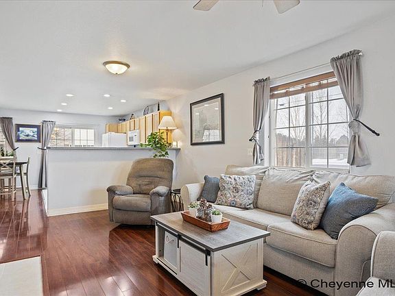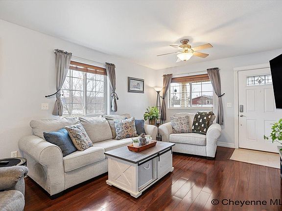 Welcome to 4703 Harmon Ave, a charming 3 bedroom, 2.5 bathroom townhome nestled on a spacious corner lot in the desirable Gateway Village West neighborhood of Cheyenne, WY. Built in 2006, this 1,536 sq ft residence offers modern comforts and thoughtful design. As you step inside, you'll be greeted by a warm and inviting atmosphere filled with natural sunlight, enhanced by heated flooring, perfect for those chilly Wyoming winters. The main level features a well-appointed kitchen with a pantry, seamlessly flowing into a separate dining area, ideal for hosting family gatherings and dinner parties. The living room boasts a cozy gas fireplace, creating a perfect spot to relax and unwind. Upstairs, the primary bedroom offers a walk-in closet and an en-suite bathroom equipped with a luxurious jetted tub. Two additional bedrooms provide ample space for family members or guests. Thermal windows throughout the home ensure energy efficiency and comfort year-round. Situated on a generous lot, the exterior of the property is equally impressive. The nicely sized yard is fully fenced, offering privacy and a safe play area for children or pets. Both the front and back yards are landscaped with sod/grass and are equipped with sprinkler systems, making lawn maintenance a breeze. A patio area provides the perfect setting for outdoor entertaining or simply enjoying a quiet evening under the Wyoming sky. Additional features include an attached one-car garage, a utility shed for extra storage, and modern appliances. The home's location offers convenient access to local amenities, schools, and parks, making it an ideal choice for those seeking comfort and convenience in a vibrant community. Don't miss the opportunity to make 4703 Harmon Ave your new home. Schedule a viewing today and experience all the wonderful features this property has to offer.