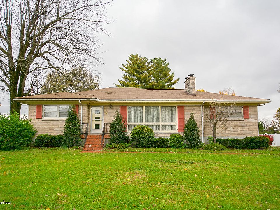 Exceptional custom built one-owner stone ranch nestled on nearly 1/2 acre with MECHANICS DREAM 3-car garage. The interior offers an excellent floor plan: 3 bedrooms (includes master suite), 2 full baths, living room with stone fireplace & picture window, family room (could be utilized as 4th bedroom), formal dining and updated eat-in kitchen with oak cabinets & inlaid tile floor. Lower level features finished family room with gas fireplace, laundry area, workshop area + ample storage. A tiled sunroom with newer casement windows completes the interior package. The xtra-tall garage is the highlight of the property with 3 bays (on auto-lifts), full electric, fluorescent lights, heat & loft storage. The extra-wide driveway offers ample parking. Close to conveniences and I-265. A MUST SEE!