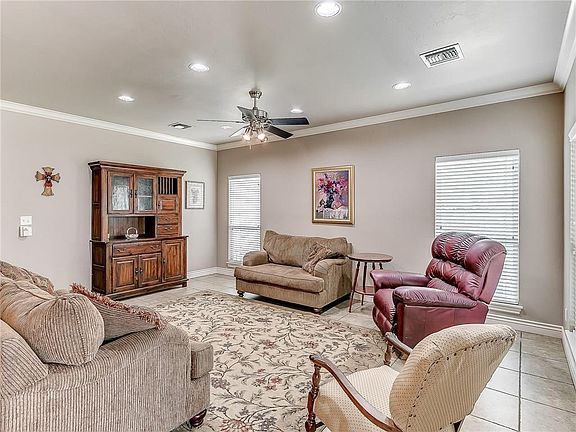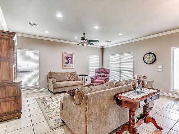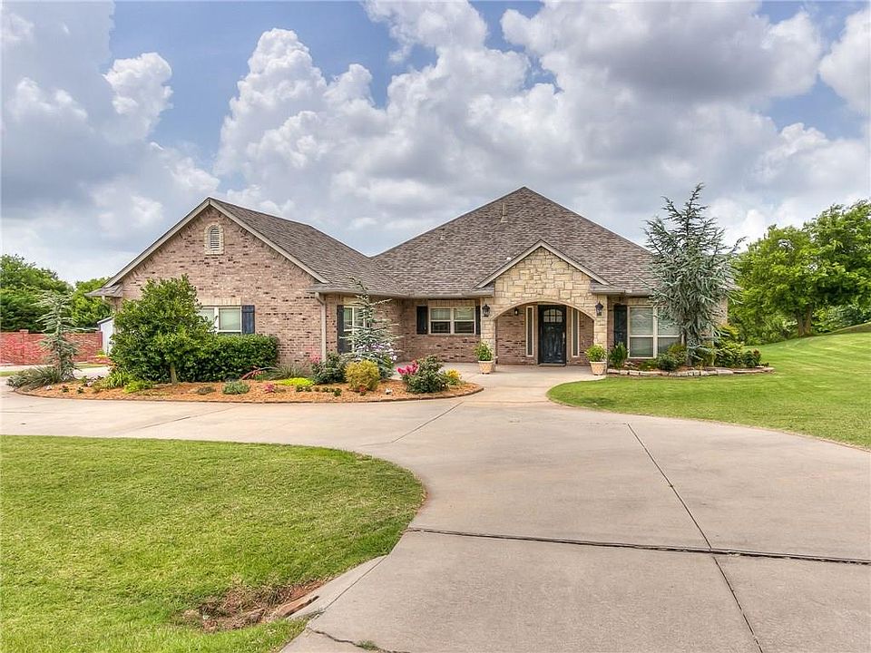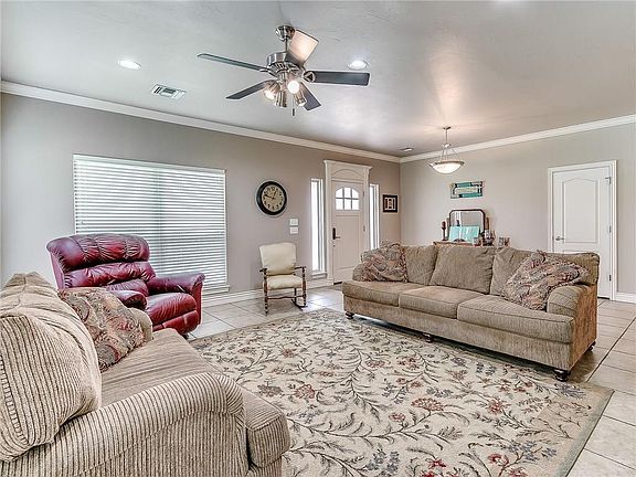 This awesome home is ready for a new family! This home offers 3 large bedrooms with built-un desks in both secondary bedrooms, 2 full baths, master has his own private entrance to patio. It also offers separate tub and large shower, wonderful size master closet with built-ins. Kitchen has all the cabinets you will need, pantry, granite counters, stainless steel appliances. Two living areas, back living offers fireplace, opening to kitchen. There are 2" blinds, large laundry room with sink and plenty of storage. Living room is wired for surround sound as well a patio. Invisible fence for pets, storm shelter outside by garage. This home is over an acre and half with partial ownership of stocked pond (catch and release.) Located in the Moore school in a gated community. Come see!!