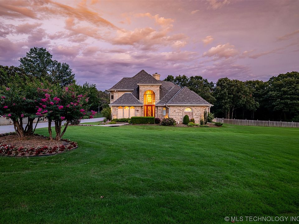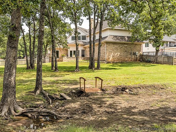 Beautiful Classic Estate on lush acre lot backing to wooded private land in coveted Country Oak Estates just a few homes from the entrance to the Oaks Country Club and 5 minutes to all the amenities at Tulsa Hills! Light and bright with soaring ceilings and lovely millwork throughout! Fabulous updated Primary Suite with Fireplace and newly updated spa-style Primary Bathroom with huge separate vanities and sleek walk-in shower! Elegant 2-story Foyer with beautiful front stairway. Front Dining or Study. Gourmet Island Kitchen open to Family Room or 2nd Dining with 2nd stairway leading to the 2nd floor; soaring Great Room with fireplace, wet bar and wall of windows overlooking backyard. Elegant Updated Master Suite on first floor with cozy fireplace and gorgeous updated spa-style Bath. 3 spacious Bedrooms upstairs, 2 with updated Pullman Bath and 1 with Private Bath, plus large Game Room. Oversized 3-Car Garage with long driving and plenty of extra parking. Welcoming Outdoor Living overlooking lush backyard with gorgeous mature trees, charming creek and tons of room for pool, play, gardening and more!