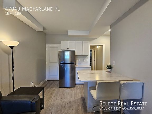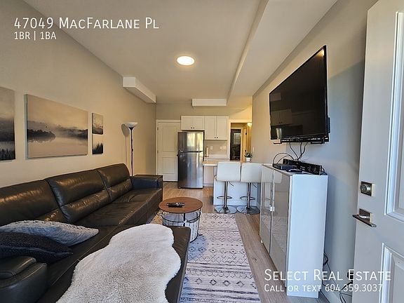 Address: 47049 MacFarlane Place, Chilliwack BC V2R 0P3 Date Available: September 1st, 2025 UTILITIES INCLUDED Bright and modern legal 1-bedroom suite featuring a spacious open-concept living area, sleek stainless steel appliances, and a cozy breakfast bar. The massive bedroom provides plenty of comfort, while the kitchen offers stylish finishes and ample storage. This suite comes fully furnished, so it's completely move-in ready. Located in the highly sought-after Promontory area, close to parks, trails, shops, and amenities. Lease Details Lease duration: 1 Year Security Deposit: Months Rent. No Smoking Property Details Bed: 1 Bath: 1 SQFT: 700 Pet Details Pets(Yes/No): No Type Allowed: None Number: 0 Size Restriction: N/A Exterior Details BBQs allowed(yes/no): No Parking type and how many: Street Parking Yard Usage: None Yard fully fenced: N/A Shed Or Shop Usage: N/A Appliances Included Fridge: Yes Range: Yes Dishwasher: No Microwave: Yes Washer/Dryer: Yes Shared Laundry: No Pay Laundry: No Fireplace: No Air conditioner: No Standalone freezer: No Utilities Gas: Included Hydro: Included Internet/Cable: Not Included Water, Sewer, Garbage: Included Utility Type Heat Source: Gas Furnace Septic/Sewer: Sewer Water Source: City Tenant Responsible for Septic pumping: No
