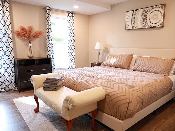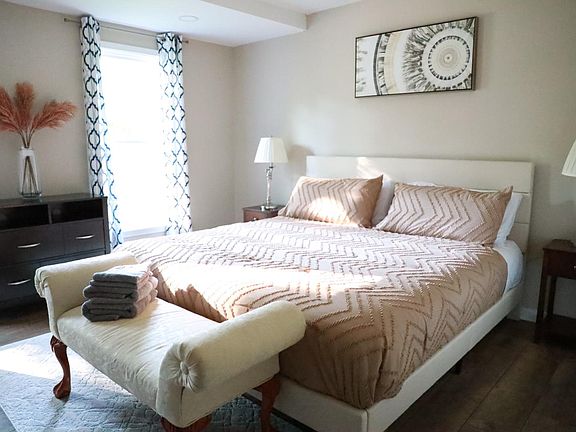 This home features a first floor primary suite and first floor secondary bedroom. Pulling into the paved driveway, you'll be greeted by the charming new vinyl siding, new roof, and bright colored door. Step inside to a spacious formal living area with beautiful vinyl flooring that flows throughout the home. Continue into the open concept great room that boasts an abundance of natural light and vaulted ceilings. Open to the great room is an eat-in kitchen equipped with brand new stainless appliances, white cabinetry, and breakfast bar. Beside the kitchen is a first floor primary with fully remodeled en suite bathroom. Also downstairs you will find a 2nd bedroom. Utilities included in rent.