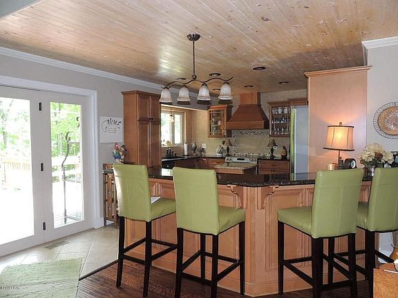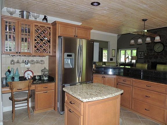 Upgrades galore!! Picture perfect inside and out! Unique floor plan with private master suite to include jetted tub, tiled walk-in shower, large closet and sitting area. Kitchen has newer cabinets, eat-at bar, stainless steel appliances, granite countertops w/ tile backsplash & wine cabinet - PLUS hardwoods on ceilings. Living room with floor to ceiling fireplace and beveled glass windows. Finished walkout basement with 4th bedroom, family room with fireplace and kitchenette. Large back deck with log cabin storage building. Beautiful treed lot of 4+ acres.