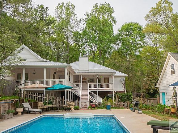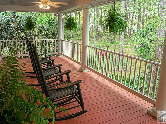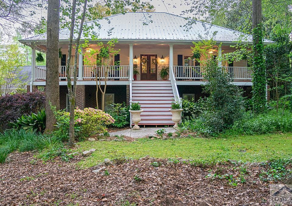 Custom-built antebellum inspired home! The front staircase leads to the covered front porch and entrance to the main floor. The foyer introduces 10-inch heart pine flooring that covers the majority of the upper floor. Upon entry, a den/sitting area/ potential dining area welcomes you with a wood-burning fireplace, built-in cabinetry, and a 16 ft+ ceiling with a loft area/flex space overhead. A master bedroom sits to left with a walk-in closet and master bath. The kitchen contains a large walk-in pantry, upgraded countertops, commercial-grade appliances and breakfast bar. A large living area is visible from the kitchen that features 14ft+ ceilings, a large woodburning fireplace, and french doors leading to the covered back porch. Downstairs you'll find four bedrooms that share a full bath as well as an additional half and a sitting/common area with adjacent laundry/utility room. The 2.69 acre property holds a 2 car garage with upstairs storage/flex space, inground swimming pool, and storage shed. Various fruit trees decorate the landscape among mature hardwood trees that provide ample shade. The home is 20 minutes from Athens, 15 minutes to Watkinsville, and 12 minutes to Monroe.