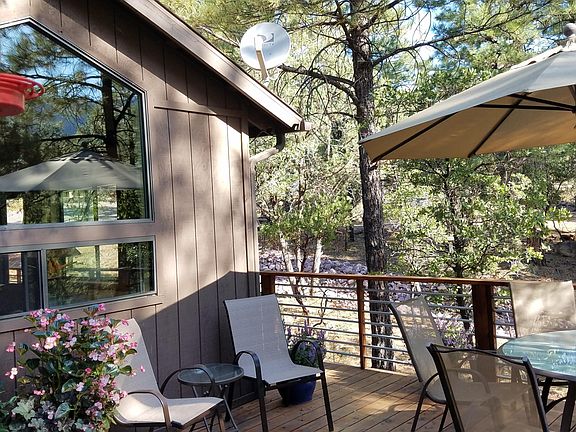 Charming cabin tucked in the forest at the end of Oak Leaf Circle. Heavily treed lot with a great view of the rim. Updated kitchen and baths.Central heat and air 2 years old.New deck 2 years old.Large master and bath up; guest bedroom, bath, laundry/bunk room down.Nice outdoor living areas: open deck off of dining, lower stone patio with firepit and built-in benches.