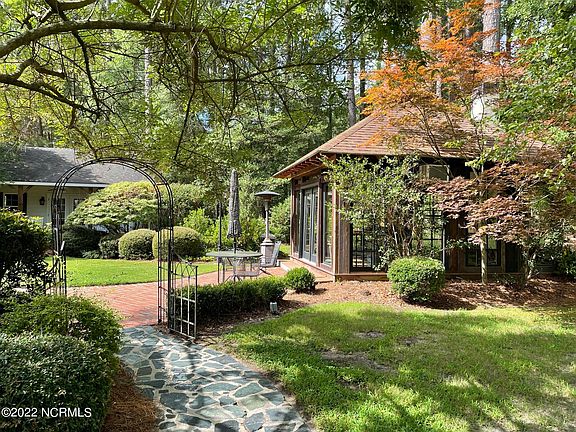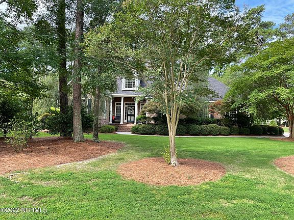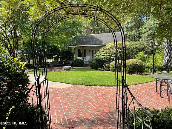 Nestled among the pine trees adjacent to the #7 fairway of the Wilson Country Club, this brick home has something for everyone. The main house, a workshop and an enclosed cabana each looking out on the beautiful William Byrd designed golf course. The lush grounds and thoughtful landscape include an irrigation system and a large brick patio with a gas fire pit. The entrance to the home welcomes you with vaulted ceilings and a desirable open floor plan with 3 living areas: living room with gas fireplace, sunroom looking out on the patio and a cozy nook off the charming breakfast room with the second gas fireplace. The downstairs master features a third gas fireplace, large bath with separate shower and jacuzzi tub and large walk-in closet. Three additional bedrooms with a full bath and powder bath are located on the other wing of the home, perfect for children or guests. All the bedrooms have large closets including one cedar closet in the middle bedroom. The kitchen has updated stainless-steel appliances, beautiful granite countertops and a large island with seating. The dining room is conveniently located off the kitchen flooded with warm natural light. Upstairs showcases a split-level bonus room with skylights and full bath. A spacious spot for wither a 5th bedroom, multi-tiered office, playroom, or media room escape. The 2-car garage includes a work sink and many storage spaces. Freshly painted interior and new carpet.