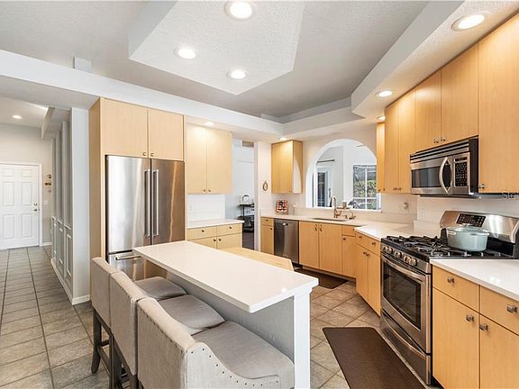 Recently Updated 3Br/2Ba + Office, 2 car garage, pool home with over 2000 sq. ft. situated among shade trees on corner lot in "The Inlets". Roof, A/C with smart thermostat, pool resurfacing, counters, bathrooms, and pool equipment all replaced within the past two years. Double entry doors open to lovely home with modern 10ft ceilings, new flooring, flawless neutral paint throughout, architectural details, and recessed 3-zone dimmable LED lighting. Huge kitchen boasts white quartz countertops, abundant cabinetry, eat in bar, built in office, stainless steel appliances, gas range, pantry, butcher block chopping area, cozy nook, and reverse osmosis water system for refrigerator and sink. Expansive living space has lots of natural light, dining area, and sliders that open to pool. Large Master Bedroom, with pool access from second set of sliders, contains one walk-in and second separate closet. Ensuite holds double sink vanity, separate garden tub, and shower with new fixtures and tile. Pretty guest bath has been completely updated with subway tile, quartz topped vanity, and stylish fixtures. Versatile office/den space shows beautiful French doors and third set of sliders to pool. Enjoy entertaining in the rescreened lanai and pool area complete with natural gas for grill. Amenity rich with whole house water softening system, central vacuum, whole-house CAT6 network cabling, blinds, attic flooring, and appliances including washer, natural gas dryer, and energy-efficient natural gas water heater. Gabled rooflines, two car garage with shaded Portico, and mature landscape adds to attractive curb appeal. Community tennis court, kayak launch, and playground available. Convenient location west of I75, close to shopping, restaurants, and grocery stores. This appealing home has a lot to offer and is move in ready. Call today-it won't last long!