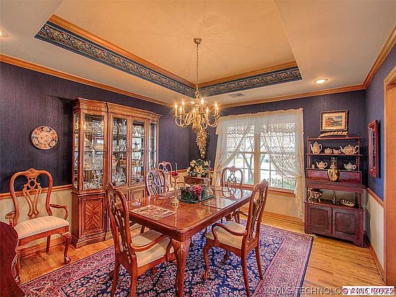Gorgeous 1 level in Jenks Southeast elementary w/spacious vaulted living & extra lrg family rm w/wood tray ceiling. Formal dining. Kitchen brkfst area has wood stove.LRG Mstr with spa bath.2 Bds w/Jack-n-Jill baths. Attic Hobby room w/H&A, 3car garage.