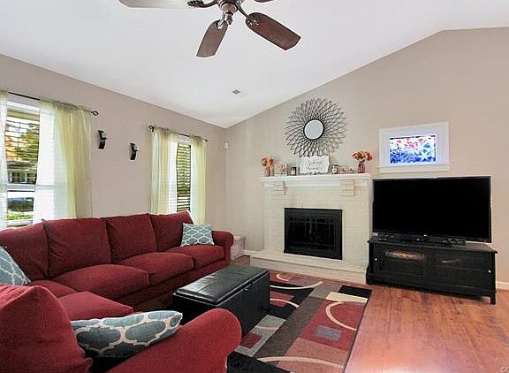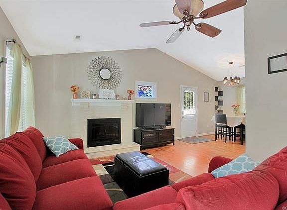 Beautiful one level living with an open floor plan! Step into an inviting family room with cozy wood burning fireplace and vaulted ceiling with laminate wood flooring throughout. Kitchen upgrades include maple cabinets and granite counters. All appliances convey. Decorator tile in the baths and carpeted bedrooms. Enjoy a spacious back yard with a privacy fence, 14x16 storage shed, a 8x10 storage shed and play equipment.