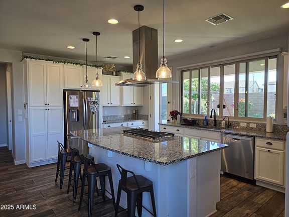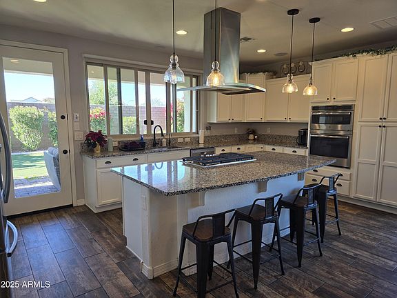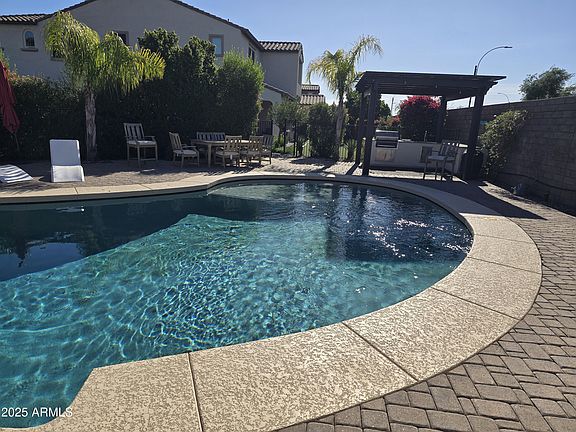 This home was featured on CBS's AMERICAN DREAM! One of the larger lots in Eastmark, this .246 acre lot offers a gated sparkling pool, mature landscape for privacy, children's swingset and trampoline, outdoor kitchen and seating with a TV, that stays. Energy efficient home with solar panels and Tesla charging station. Open concept kitchen with expansive granite countertop and spacious great room. Inside this desirable 2 story home, flexibility reigns. Primary suite can be downstairs or upstairs as needed. Customize the flex room to your needs -formal dining area, play area, den or office. Immediately inside the front door, store items in the nook by the stairs. Perfect to catch and organize for your next trip out. Hooks for backpacks, computer bags, coats or sweaters. Stop clutter before it begins! Need a mother-in-law suite or prefer the primary bedroom to be downstairs? It's just off the kitchen, a spacious en suite with direct access to the backyard. Options abound to fit your family's needs. Upstairs has an office with built in desk and brackets for computer screens. The loft can be a play area or quiet space, as you desire. Bathrooms and bedrooms offer flexibility for large family or entertaining. A must see home. Come and make it your own!