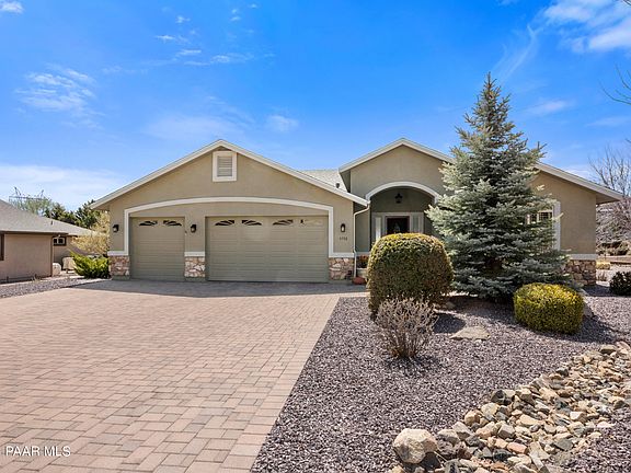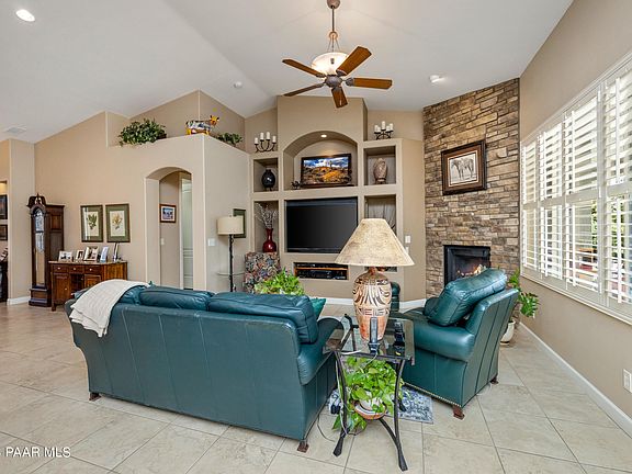 Located in the highly desirable Yavapai Hills subdivision and close to amenities and local shopping, including Trader Joe's and Costco, this tastefully and meticulously maintained and upgraded single-level ranch-style home offers outstanding curb appeal and spectacular Glassford Hill views on an oversized, flat,usable lot. On arrival you'll immediately notice the oversized paver driveway. Entering the home via a beautiful security door, you walk into the impressive open foyer with recessed art niches, plant pot shelving accents and vaulted ceilings leading into the great room, which is tiled and has plantationwindow shutters, along with the majority of the home. The floor-to-ceiling stack stone linear fireplace creates a superb central feature. There's a built-in media niche as