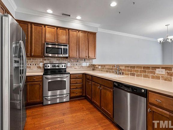 Welcome to this beautiful former model home end unit townhouse! Walk in & be greeted by open flr plan w/ beautiful hand scraped hardwood flr & crown molding thru 1st flr. Enjoy cooking in the spacious kitchen featuring SS appliances, custom cabinets, recessed lighting, & tile backsplash. Dining area open to living room - perfect for entertaining. Kick back & relax by Gas log fireplace with tile surrounding. Upstairs offers master suite w/ vaulted ceiling + 2 addtnl bedrooms. Prime location near NC State.