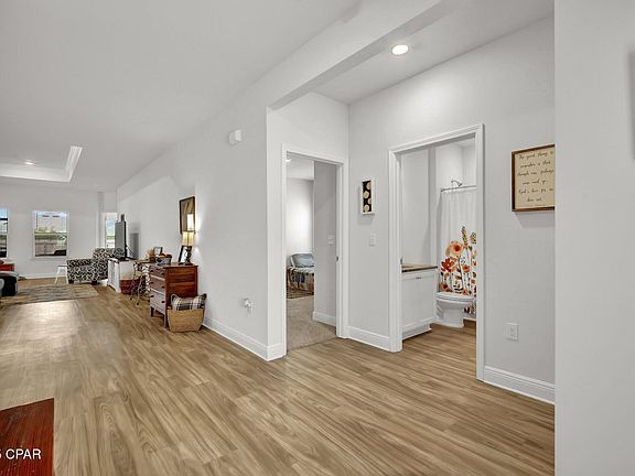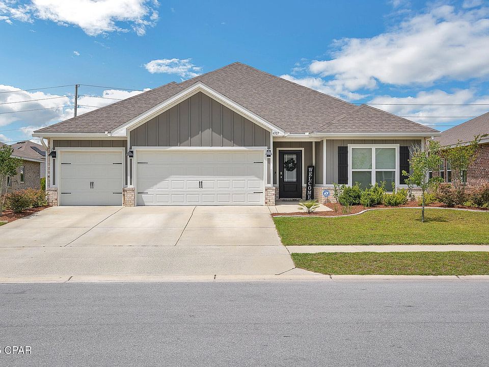 This spacious rental home has 4 bedrooms, 3 full bathrooms, and a generous 3 car garage is ready for immediate move in. Inside you'll find a bright and airy open floor plan that seamlessly connects the large living room to a modern kitchen, complete with stainless steel appliances, shaker style cabinets, a massive kitchen island, a beautiful back splash, walk-in pantry, and shiny granite countertops. The master bedroom boasts a huge walk-in closet and an en suite bathroom. Enjoy privacy with a split floor plan, highlighting 9' ceilings throughout, LVP flooring, and elegant trayed ceilings in both the living room and master suite. The laundry room is equipped with a brand-new built-in shelving and cabinet system, offering convenience and organization. Outside, you'll find a screened in back porch, perfect for relaxing or entertaining, along with a fully fenced in backyard. Located conveniently off Highway 390 and just north of Highway 231, Titus Park is surrounded by an array of shopping, dining, schools, and parks! It's ideally located between Tyndall Air Force Base and NSA Panama City, with a short commute to each. You're just minutes away from the beautiful North Bay and Saint Andrew's Beaches. Exciting news-Titus Park also features a community pool. ASK ABOUT OUR MILITARY SPECIAL!