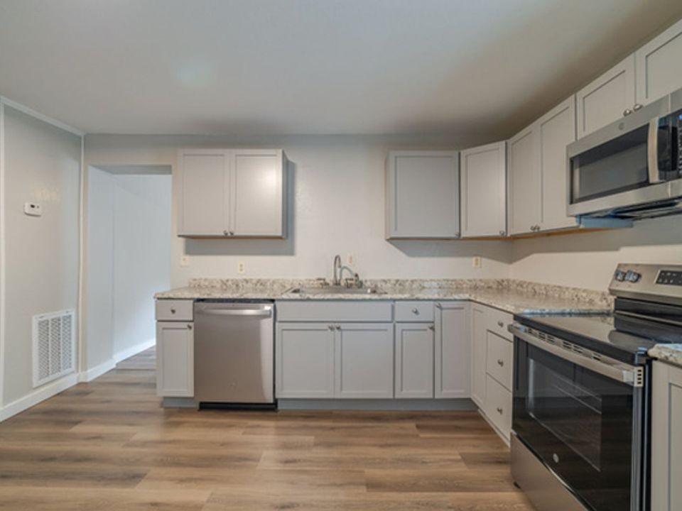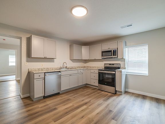 Completely Renovated Apartment in Maryville Available! Fresh paint, new LVP flooring, remodeled kitchen including new cabinets and countertops and all new appliances, as well as renovations to both bathrooms. All rooms on main level of this triplex with parking available on site. The appliance list includes a range, microwave, dishwasher, and refrigerator. There are two large bedrooms with a possible third small bedroom, office or den. Washer and Dryer hookups also available. A private patio out back overlooks a creek.