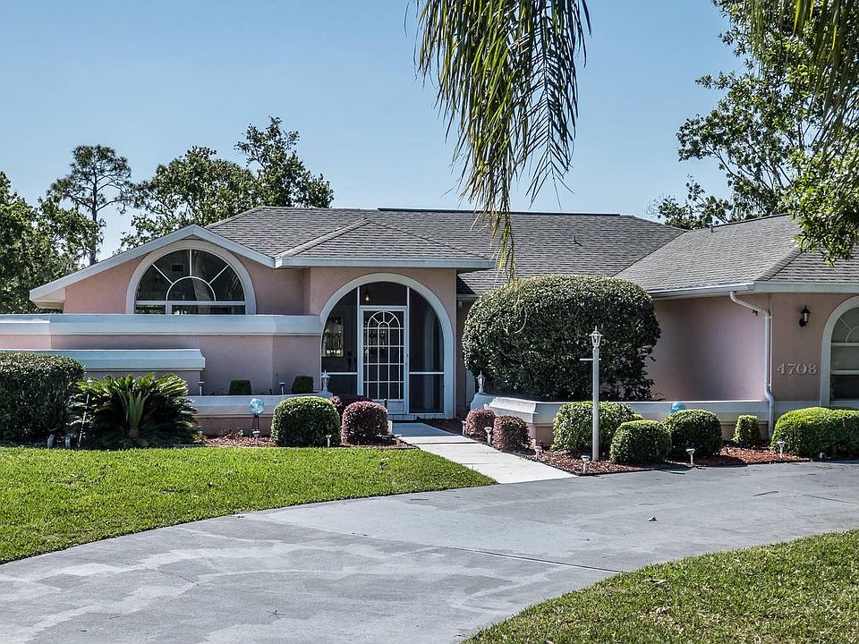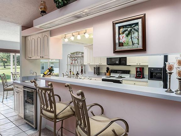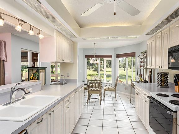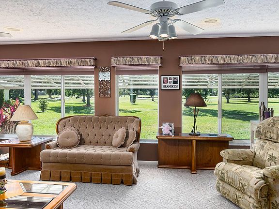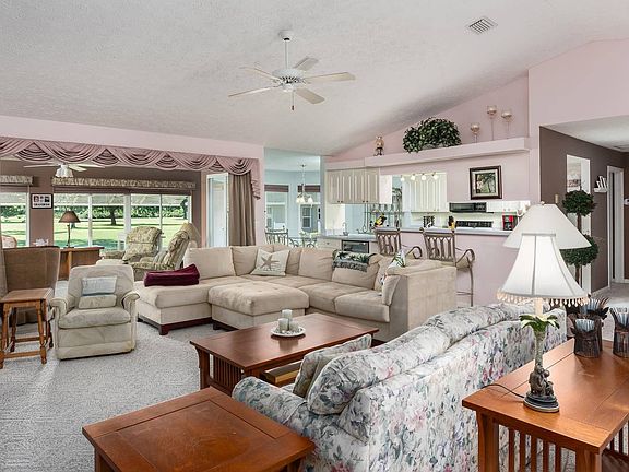 Move-in ready Golf Course home. On an oversized corner lot, this open floor plan home boasts many features such as the circular driveway, double leaded glass front doors, screened front porch, screen Lanai in rear and 2 car plus golf cart w/ skeeter beater Gar. Inside you ll find cathedral ceilings, an 18x18 LR and a huge FR with casement windows, spacious kitchen with breakfast bar plus dining area and wet bar with wine cooler. The owner s suite has a large walk-in closet, double sinks, makeup area, jetted corner tub and ceramic shower. Other features incl whole house fan, central vac, sound system, newer A/C w/ warranty, new irrigation pump and timer and 30 yr shingles.