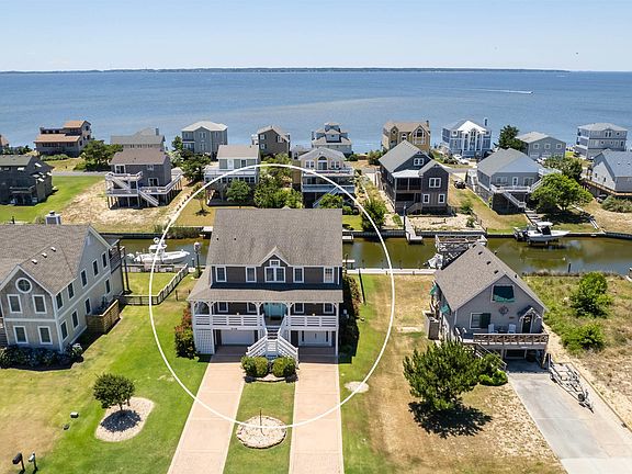 Constructed on an elevated canal-front lot, this home is centrally located in Nags Head convenient to grocery stores, shopping and restaurants. West facing views from the living & dining room or either of the covered porches mean you'll never miss another OBX sunset. The house spans 3 levels, all accessible via elevator, and includes 3 spacious bedroom, 5 full baths, two dining areas, living room, a family room, and an additional flex room currently set up with a queen size bed. The well appointed gourmet kitchen features a large center island with gas range, ample cabinets, built in desk, stacked ovens, walk-in pantry, and bar seating. The primary suite features large windows, walk-in closet with built in shelving, walk-in tiled shower, and private access to the second level covered porch. Each bedroom features a private bath. Additional interior highlights include vaulted ceilings, wood paneling, gas fireplace, hardwood and ceramic tile flooring, a reel room with electronic lock, and a single car garage. Exterior features include covered porches on both the front and back of the home, outdoor shower, and fish cleaning station while the lot boasts mature landscaping, bulkhead, private dock, 20,000# boat lift, fenced back yard, both sound and canal views. The property provides plenty of space both inside and outside for entertaining or finding a quiet place to relax. Recent updates include new mini split in Family room, new interior paint 2021/2023, 2 new HVACs 2021, dehumidifier 2023, 2-tankless hot water heaters 2022, and new boat lift bunks 2022. Residents of Old Nags Head Cove enjoy community amenities such as a picnic area, volleyball court, outdoor pool, clubhouse, and boat ramp. Located approximately 60 miles from the Gulf Stream, fishing enthusiasts have easy access to some of the East Coast's finest angling spots. Contact an agent today to arrange your viewing appointment.