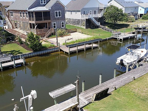 Custom Built in 2006, one owner and never rented. Vinyl shake siding, 3 door garage, located one street back from the sound on the canal front. Boat lift, new docking since these pictures, including benches and fish table. Master suite with hardwood floors, walk-in closet and extra-large double-headed shower. Two king bedrooms with hardwood floors and ensuites. All located on the second floor. Located on top level is the living room with vaulted juniper ceiling, hand-scraped hardwood floors and gas log fireplace, chef kitchen with professional appliances, granite counter tops, walk in pantry, gas stovetop, double ovens, and warming drawer. The dining room, kitchen, and a full bath all have tile flooring. Anderson windows and doors throughout. Elevator access on all three floors. 1 storage room and 3 storage closets, tool/workshop room (could be a bedroom) and a full bathroom with heat/air and the washer and dryer are all located on bottom level with a two-car garage. The bar area with sink is located in the garage with gas brick heating. Outside shower, and sink with storage located on the back of the house. House is wired with a surround sound stereo system and outdoor speakers. Two full-back upper decks with great views of the sound. Security and sprinkler systems. Located in the Old Nags Head Cove community which is one of the few water access areas on the OBX you will have direct access to the sound for all your water recreational needs. HOA fees are $125 a year for basic, additional fees for the community boat ramp and the swimming pool located at the clubhouse.