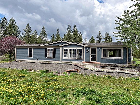 This 3 bed, 2 bath home is situated on 4.76 acres of land and is located just 20 minutes from downtown Spokane. The home boasts a spacious, open floor plan with a great room and an updated kitchen w/ island and eating bar and stainless steel appliances and plenty of storage. The large master suite includes a spa-like bath with a walk-in shower. The two additional bedrooms provide ample space. The exterior is surrounded by acres of lush green space, providing a stunning backdrop for outdoor activities. Enjoy the convenience of being close to all of the amenities of downtown while still having the peace and tranquility of the countryside. 24x24 shop in the back ready for you. Bring your toys and animals!