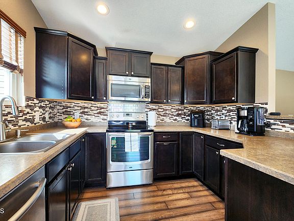 Don't miss this beautiful 5 bedroom 3 bath home. Convenient main floor living with three bedrooms on the first floor, and two in the basement! Open concept kitchen to living room area, with large windows for an abundance of natural light! Custom bench with additional storage creates the perfect eat-in nook. Primary bedroom has a custom walk-in closet that is a must see! The basement has all new flooring! A large living area with a cozy stone fire place, two bedrooms and one bath. Large storage closet and plenty of space in the utility room for additional storage. Brand new furnace (July 2023) and brand new water heater (Sept 2023). The stamped patio includes a custom built gas fire pit, large shed, a fully fenced in yard, and a brand new playset (Sept 2022)! Seller is also including washer, dryer (Dec 2022), AND the basement sectional and rug!