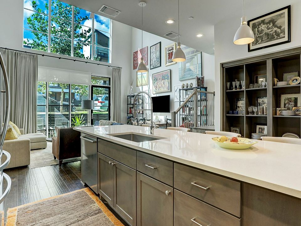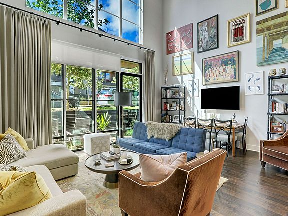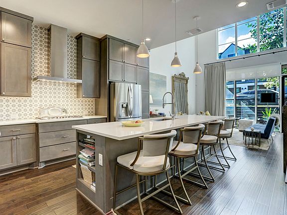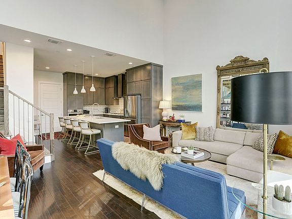 Experience luxury and convenience in this immaculate, three-story townhome at The Grove, boasting three bedrooms and three and a half bathrooms. Optionally available furnished, this exquisite home features soaring ceilings and a stunning array of designer touches throughout. As you enter, you are greeted by a charming fenced patio area, meticulously maintained by the Homeowners Association. This leads into a bright living room with a wall of windows artfully graced with custom draperies and a dramatic two-story living area boasting a gallery wall that artfully integrates the television with fine art. The state-of-the-art kitchen includes appliances, custom-built-ins, and a large eat-in center waterfall island, with direct access from the two-car garage and a convenient and gorgeously wallpapered half bath on the main floor. The primary suite features a full walk-through closet, a stackable washer and dryer, gorgeous bright wallpaper (not pictured), and a massive bathroom equipped with a luxurious tub, shower, and a double vanity sink adorned with exquisite finishes. The vibrant third floor hosts two additional bedrooms, each with en-suite baths, popping with lively colors. The home has two laundry areas, adding practicality to its luxurious amenities. Another highlight is the covered outdoor patio on this level, which offers an extended living space for entertainment or tranquil leisure. This townhome is not just a residence but a lifestyle choice, perfect for those seeking a stylish, lock-and-leave property. The Grove now has so many great restaurants, exercise options and conveniences just steps away and more is planned! This home was one of the original higher quality builds and most of the construction surrounding is complete, with a superior location and style. Step into a new lifestyle with this exceptional home, where every detail is curated for comfort and style.