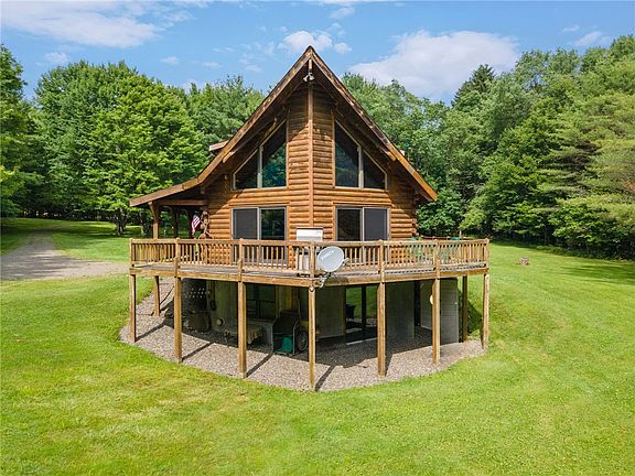 Your tranquil escape awaits on 52 acres in this stunning 3-bed 2-bath log cabin in an idyllic, private setting just 20 mins from Cooperstown & Otsego Lake! This charming home is inviting & bright w/ cathedral ceilings, knotty pine paneling & open floor plan living room, dining area & eat-in kitchen. The primary bedroom on the 2nd floor features a balcony, walk-in closet & ensuite bath w/ soaking tub & walk-in shower. Unwind on a gorgeous wraparound deck overlooking a vast, open yard enjoying the scenic wildlife & beautiful mountain views or hike your own trails crossing a wooden bridge over a year-round creek. The property also features a handyman farmhouse that could be renovated into a guest house. Easy access to I-88 & Oneonta & just 3mi to Hooker Mtn State Forest trout fishing streams