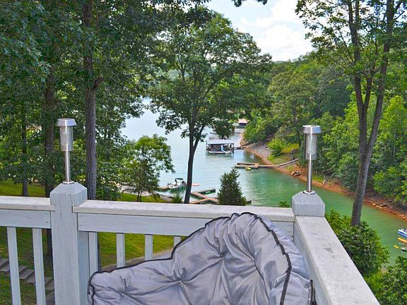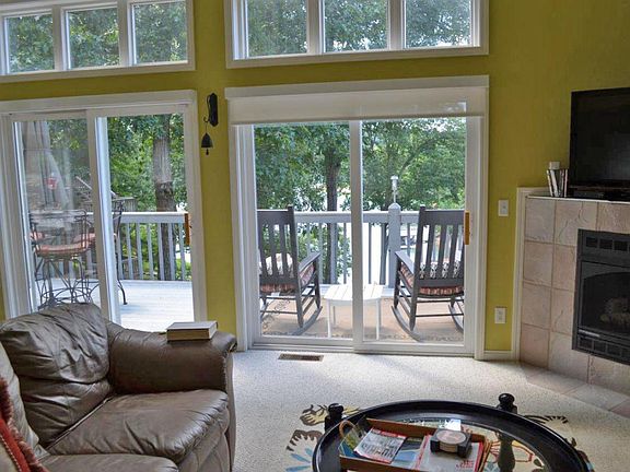 Lakefront villa with room for everything and everyone. Enter into a very large lofted greatroom with kitchen and livingroom. 2 master bedrooms (one on the top floor, and one on the lowest level). Livingrooms on both middle floors. Down one level from the entry is a cozy but spacious livingroom with two bedrooms and deck overlooking the lake. Lowest level is a very large master suite that exits out to the concrete path to the lake and docks. Lowest level also has a massive bonus storage space. Home is selling furnished and ready to move into. Professionally decorated and one of a kind. Fees for Deerwood Villas include lawn maintenance and dock space.