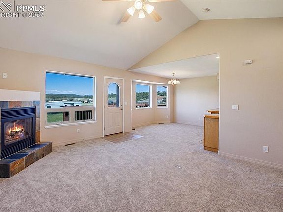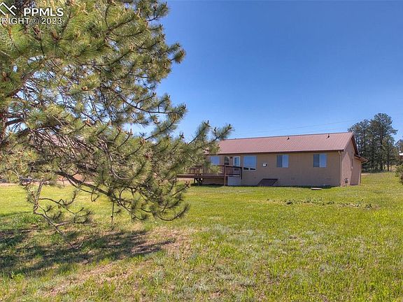 This meticulously maintained home nestled in the tranquil serenity of a peaceful neighborhood, offers the best of both worlds – quiet seclusion off the main road, yet conveniently close to Teller 1 access. You'll love the metal roof with its contemporary appeal and long-lasting durability. The new exterior stucco siding is a low to no maintenance bonus. The manicured lawn, shaded by a beautiful mature tree, is ideal for playtime or energetic pets. The walkout deck is a delightful spot for relaxation and outdoor dining. An all main level living design with an open concept, seamlessly connects the living room, dining area, and kitchen. Ceiling fans provide a gentle breeze and fresh new carpet throughout the house exudes a sense of modernity. The living room features a cozy gas fireplace, perfect for those chilly Colorado evenings, while large windows fill the space with natural light. Kitchen highlights include a stainless steel natural gas range/oven, plenty of kitchen cabinet storage, and a convenient pantry. Tile countertops and a breakfast bar add an elegant touch to the space. This home is the embodiment of comfort and convenience. Stackable washer/dryer offers space efficiency while forced air furnace and natural gas, ensure year-round comfort and utilities efficiency. The spacious primary bedroom has vaulted ceilings, a ceiling fan, a large arched window along with a true walk-in closet with shelving for your organizational needs. Also enjoy the privacy benefits of an attached bath. All living spaces have been freshly painted, creating a bright and inviting atmosphere. You'll be pleased this home is broadband wired, keeping you connected to work and entertainment. The attached garage has upper storage space, shelving, and cabinets. Reap the benefits of well water and a septic system too. Whether you're looking for a peaceful retreat or a modern, comfortable space, this home is the ideal canvas for you to embrace the Colorado spirit and lifestyle.