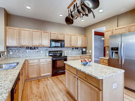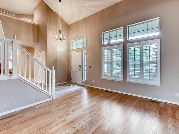 Spacious 5 bedroom home in the Rolling Hills of Thorncreek golf community! As you step into this home you are met with vaulted ceilings, new hardwood floors, and a dining room that has a full butler's pantry area perfect for entertaining. Continue into the eat-in kitchen and out the back door to a large deck with a built-in grill. Additional features: new AC, upgraded hail resistant roof in 2014, granite counters, master bedroom with private deck and views of the Rocky Mountains, a main floor bedroom that can also be used as an office, 3 car garage, and a walk-out basement with a craft room, office space, wet bar, and media area. Sellers are moving out of state, so multiple items will be staying including all appliances, 70" flat screen TV, two 55" flat screen TVs, and three receivers that are connected to surround sound wall speakers on all three floors! You can feel the love and care throughout this home with creative additions and storage that makes it move-in ready!