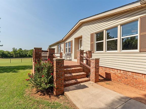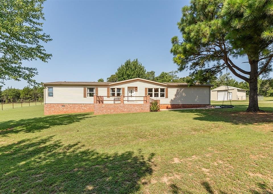 Look at this beauty on 2.5 acres in Choctaw! This lovely manufactured home sits on a well manicured acreage with large trees, an electric gate, an outstanding garage, and a shop measuring 20x24. The concrete drive was recently installed. This lovely home 4 bedroom 3 bathroom home boast a beautiful brick front patio, brick skirting and a gorgeous brick floored back patio to watch those Oklahoma sunsets! This solitaire features 2x6 walls, sheetrock throughout. Large open living room with a corner fireplace, built in bookcases. It flows nicely into a completely remodeled kitchen. Gorgeous cabinetry, beautiful backsplash and granite countertops and a breakfast bar. Wonderful large dining area. This Home has it all, including vinyl laminate flooring throughout! Large utility room, & a wonderful-sized pantry. The master bedroom is huge with a nice-sized walk-in closet! The icing on the cake is the beautiful tile flooring in the master bath with the pink cabinetry and double vanity! Large shower and great bathtub. Every inch of this house has been remodeled and looks so nice! This home is a true mother-in-law floor plan. The other three bedrooms are on the opposite side of the home with a remodeled bath in between. The bathroom has double vanities and lots of cabinetry for storage. Large shower and separate tub. There’s an inground storm shelter. Close to Choctaw and still 15 minutes away from Tinker Air Force Base, Boeing, and Downtown OKC!! Don’t miss out on this spectacular home!
