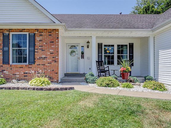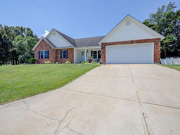 Custom great room ranch with brick front and covered porch. Entry foyer to open floor plan, predominate hardwood flooring, vaulted ceiling, formal Dining Room, comfortable Family Room with 3 window wall and centered gas fireplace. Hearth area adjoining Breakfast Room, light & bright kitchen with 42” cabinets, tiled backsplash, granite countertops, stainless appliances, center island and walk-in pantry. French Doors lead to a covered patio and vinyl fenced yard, ideal for children or pets. Main floor laundry on the main level. Spacious Master Suite with 4 window bay, trey ceiling, double vanity bathroom w/separate tub & shower and walk-in closet. Lower level is partially finished and includes Family/Game Room, full bath and wine cellar. Plenty of unfinished area for storage or potential development. On cul-de-sac minutes to major highways (I-70,I-270,364/94), Katy Trail, Downtown St. Charles and Streets of St Charles.