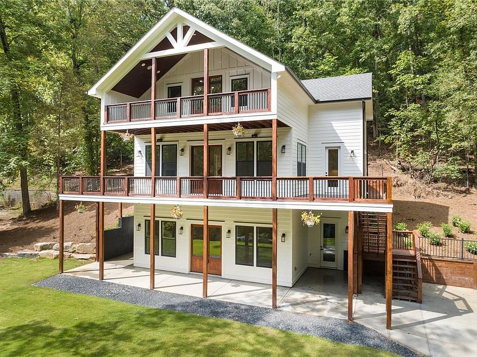 WOW!! You won't believe this BRAND NEW CONSTRUCTION with ALWAYS deep water and a SUPER easy walk to the dock with fabulous seasonal views. As you drive down Sams Road and come upon this gorgeous lake home that is partially contemporary, yet has the feel of the lake, you will be absolutely amazed. This is a home you will be so proud of when your friends and family come to visit! Party at your house! Or...you can enjoy a relaxing, laid-back time with just the ones you love. This is a home that you will enjoy all 4 seasons. Cozy up to the fireplace and outdoor firepit during the chilly months and spend the rest of the time on the lake skiing, wake boarding, surfing or just floating around the NEWLY updated dock that needs absolutely no maintenance. Guys, you have to come and look at this MOST amazing home where the builder has so many upgrades and the construction will last a lifetime. With 3 bedrooms (per septic permit) and 4 full baths + two 1/2 baths there are other rooms that can also be used as additional sleeping areas. Need a workspace? You'll find an additional office, bedroom, and flex room for your needs. Immerse yourself in music or entertainment as the home has speakers on the decks, kitchen, and lower level. The property is pre-wired for cameras and offers plumbing for a bar on the lower level too! Did we mention there are 2 laundry rooms?! This home was built with 2 x 6 construction, custom mahogany doors, 12-foot ceilings on the lower level, and the main floor has 10-foot ceilings. The upper floor continues the sense of openness with 9 and 10-foot ceilings. Just wait until you see the kitchen...WOW is all we can say. You've got to see it to believe it! It is a chef's dream featuring a GE Luxury Appliance Cafe package, including a 48-inch dual fuel range, 6 burner stovetop, griddle and microwave. The refrigerator includes a beverage center, perfectly complementing the gorgeous custom cabinets and quartz countertops. The custom pantry and mudroom provide convenience and style. As you head outside, indulge in the outdoor shower and enjoy the dusk-to-dawn path lights and rear super oversized firepit. This home is designed for efficiency with three HVAC units, 2 water heaters, spray foam insulation and the dock has a generator and solar panels to power the boat lift and lighting. With 3 levels, there is a place for everyone. Cooking, entertaining, relaxing, playing games, sleeping, watching the football games in the fall...this one has it ALL-whether you seek a family haven, a second home, or an investment property with potential income! We have virtually staged several of the rooms to give you an idea of what can be yours. Only 5 minutes from 400, you will feel like you are a million miles away, yet close to anything your heart desires. Please don't miss the virtual tour. Please know that Sams Road is partially on Corps property. Most of the docks are across Sams Rd from the houses.