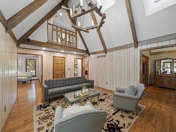 NOW INCLUDES ADJACENT LOT - NEARLY 1 ACRE IN SHAWNEE! Here’s your chance to own something truly special—nestled in nature’s beauty yet just minutes from downtown Shawnee! This custom-built 5-bedroom home sits on nearly an acre and offers beautiful curb appeal, extensive landscaping, and exceptional design throughout. The main level features a stunning great room with open-beam cathedral ceilings and a dramatic floor-to-ceiling fireplace, a main-level primary suite, and a spacious, fully equipped kitchen with a breakfast room, island, and eating bar. Additional highlights include a vaulted formal dining room, a flexible den/family room/office, and a light-filled sitting room overlooking the pool and sunsets. Wood floors and picture windows enhance much of the main level, bringing in warmth and natural light. Upstairs, you’ll find three generous bedrooms, a full bath, skylights, and abundant storage. The finished lower level is ideal for entertaining or relaxing, featuring a cozy fireplace, rec room, full bath, laundry area, workshop, and a fifth bedroom with a wet bar/kitchenette—perfect as a pool house or guest suite. Step outside from either the living room or primary suite to enjoy an al fresco meal on the low-maintenance deck, splash in the in-ground pool, sunbathe on the patio, or unwind on the tiered covered terrace. Dive into your private pool or take a refreshing swim in the lake—welcome to Black Swan, a hidden gem of a private lake community.
