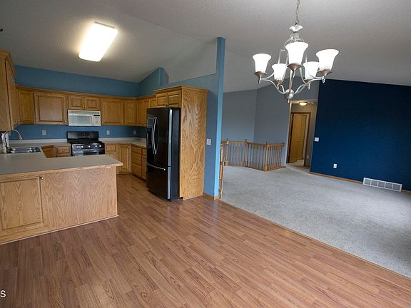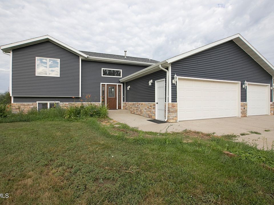 Looking for your own rural property just minutes from Bismarck? This property has a lot to offer with new siding, roof, exterior doors (excluding sliding glass door), and many new appliances. The deck is maintenance free and faces the west. Enjoy watching the sunset across the large backyard. The home sits on 2.51 acres with many fruit trees and well water on a spigot system throughout the backyard to conveniently take care of them. A sprinkler system services the front yard and back yard (to where the spigots start). Inside, there are 2 bedrooms and 1 full bathroom on each floor. The vaulted ceiling and large windows let the sunshine in. Downstairs, enjoy quiet evenings by the gas fireplace with your own built in bar. The bar has a mini fridge also. The 3 stall garage is insulated, heated, and has cold/hot water. There is a generator hookup with cable on the north side of the house. VA qualified Buyers, ask your REALTOR for details about the low interest assumable loan that may be available to you.