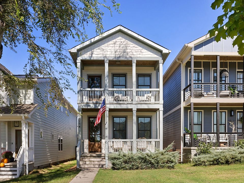This Entertainer’s dream home offers seamless indoor-outdoor living with a garage door that runs along the back of the living area that can be opened at a moments notice onto a spacious deck and maintenance-free Turf backyard. The charming exterior includes double front porches and a two-car garage port with alley access. The main level features a freshly painted, open floor plan with sand and stain hardwood floors and a guest suite or office. The open kitchen has a large island with seating for four and a gas fireplace that adds warmth to the adjoining living area. The large primary suite upstairs provides comfort and privacy with two additional upstairs bedrooms, one featuring a vaulted ceiling and access to the second-story front porch. Located on one of the most sought-after streets in The Nations, within walking distance to popular restaurants and coffee shops with easy access to the interstate. New Tankless Water Heater 2024 Check out the WALKTHROUGH VIDEO